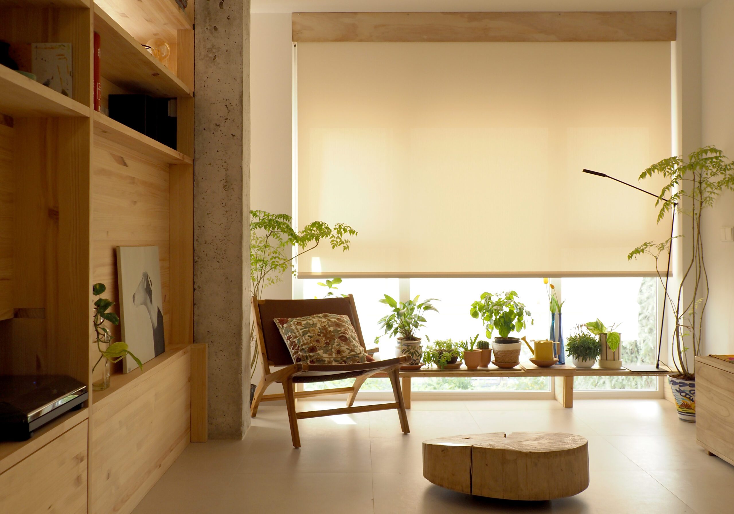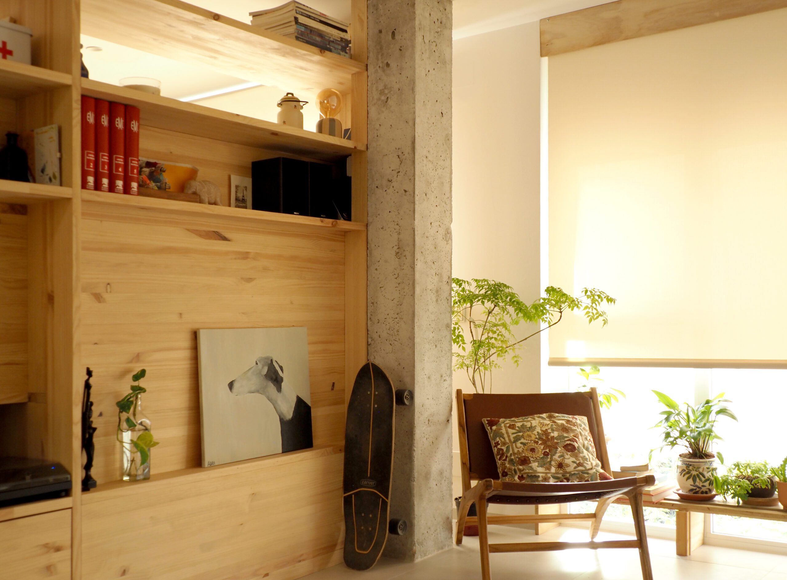 En términos estéticos, la combinación de materiales neutros construye una atmósfera de armonía y simplicidad. La madera y el hormigón visto establecen un lenguaje sereno, capaz de envejecer con dignidad y de dialogar con la luz cambiante que se filtra desde el jardín