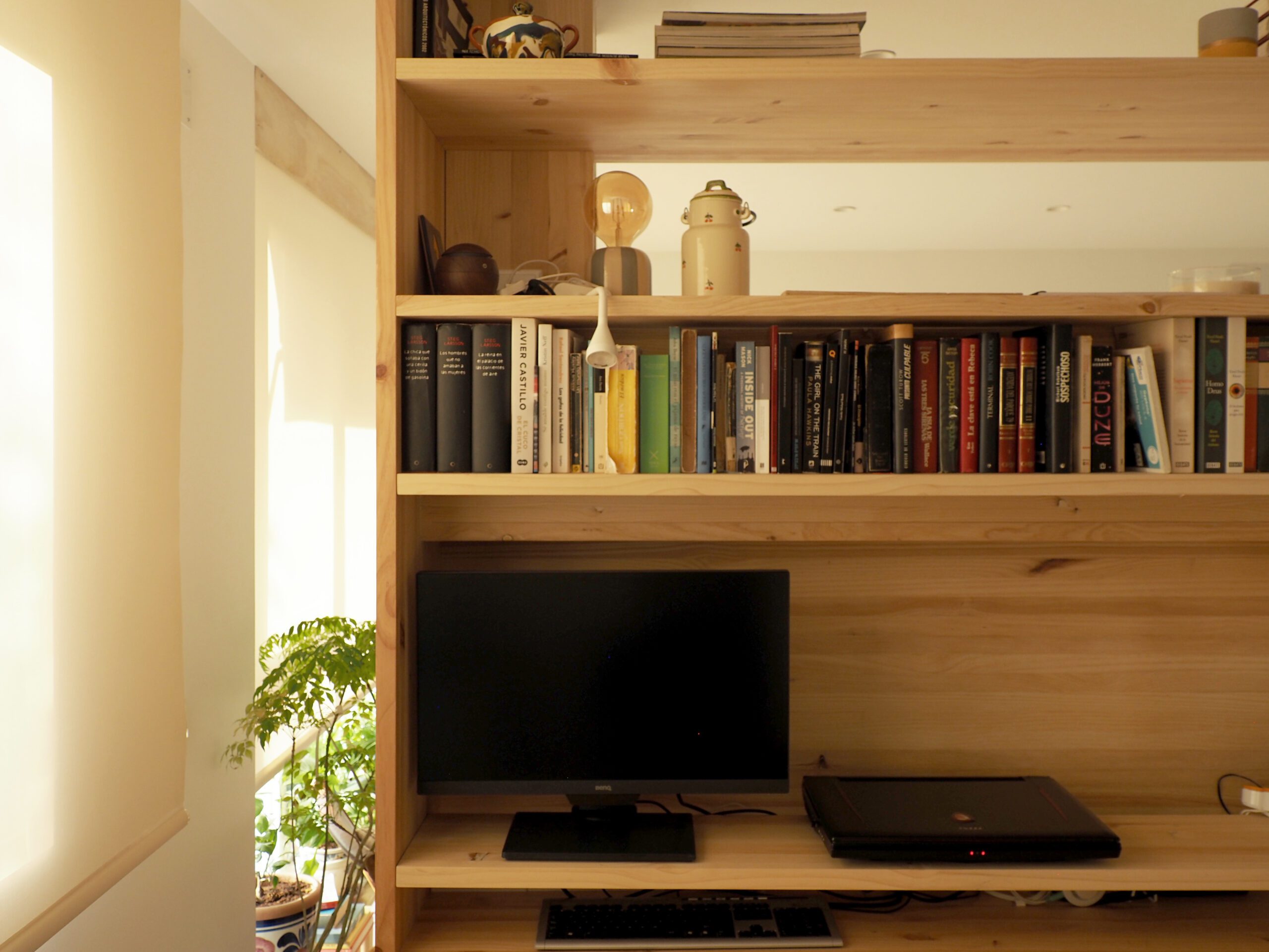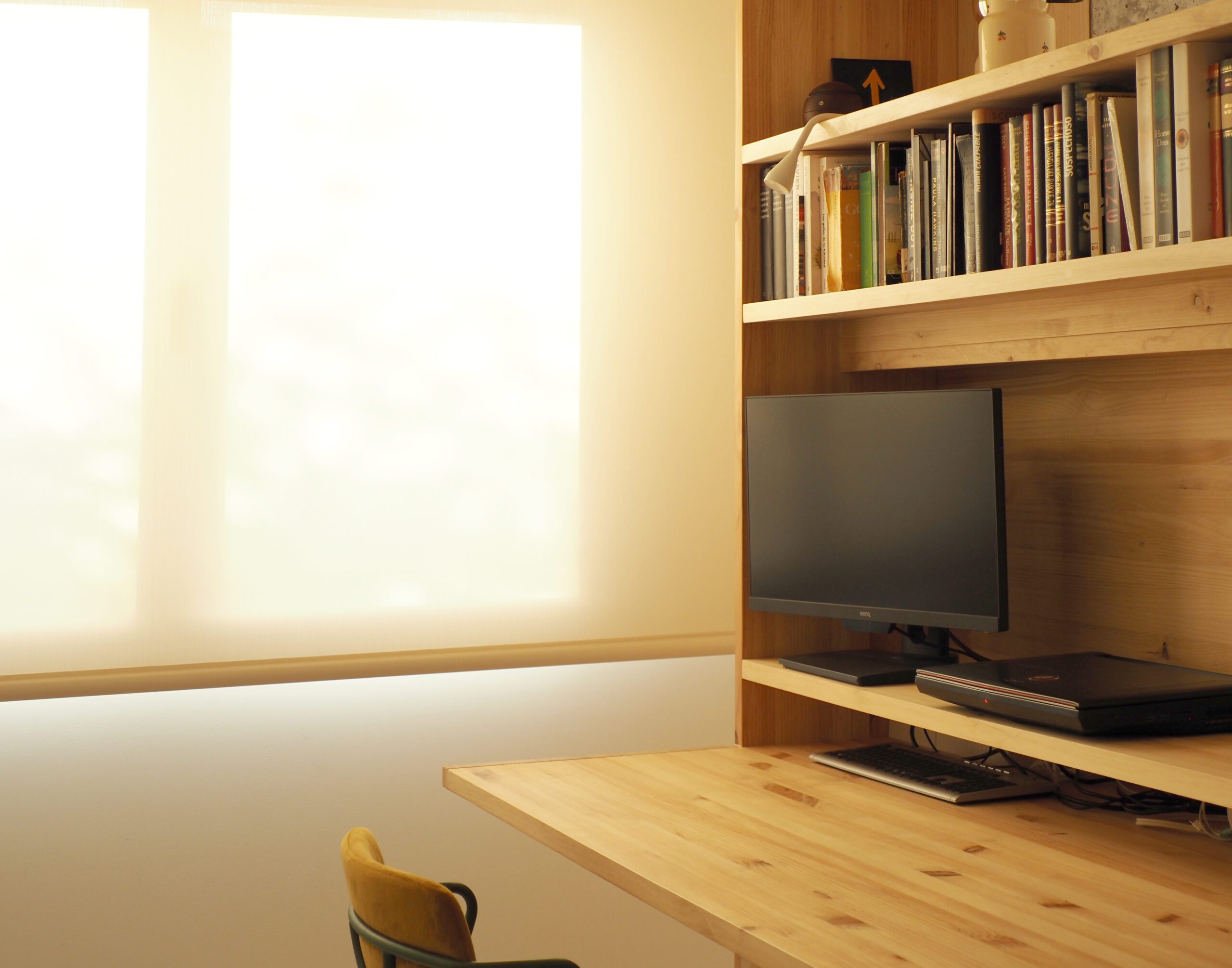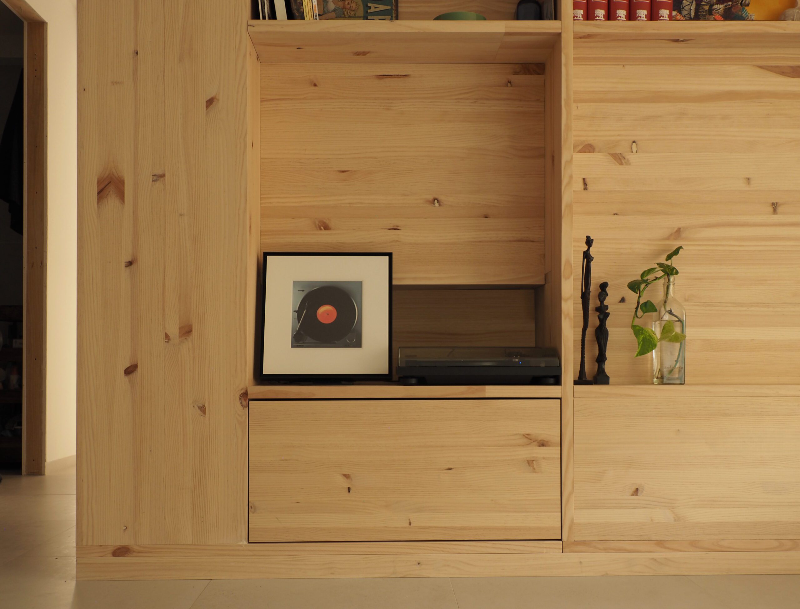 Un único mueble, diseñado a medida, articula los espacios principales de la casa. Con un gesto sutil, separa el salón del estudio sin interrumpir la entrada de luz ni la comunicación visual entre ambos. Así, se configura una jerarquía espacial que se despliega en una secuencia creciente de intimidad.